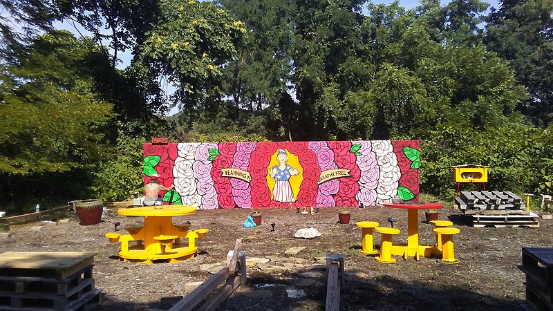 Emma Lazarus Park (also known as Emma Lazarus Sensory Garden) was founded in the Carrick neighborhood of Pittsburgh in the Spring of 2019, by property owner Shoham Ariel Zober. The park includes several features, such as a mural at its center, by local artist Brian Gonnella, as well as handcrafted tables and a little library created by Master of Creative Reuse Brad Bianchi, originally from Pittsburgh’s South Side.